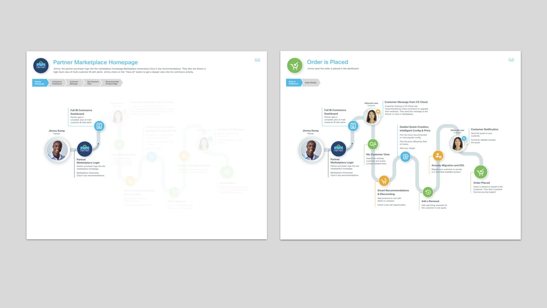 The detailed wireframes were mapped to key milestones in the user journey, with annotations highlighting design improvements and explaining how they enhanced efficiency and profitability for both Cisco partners and the business.