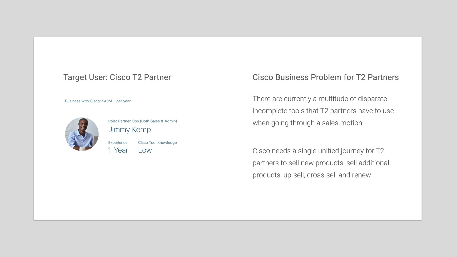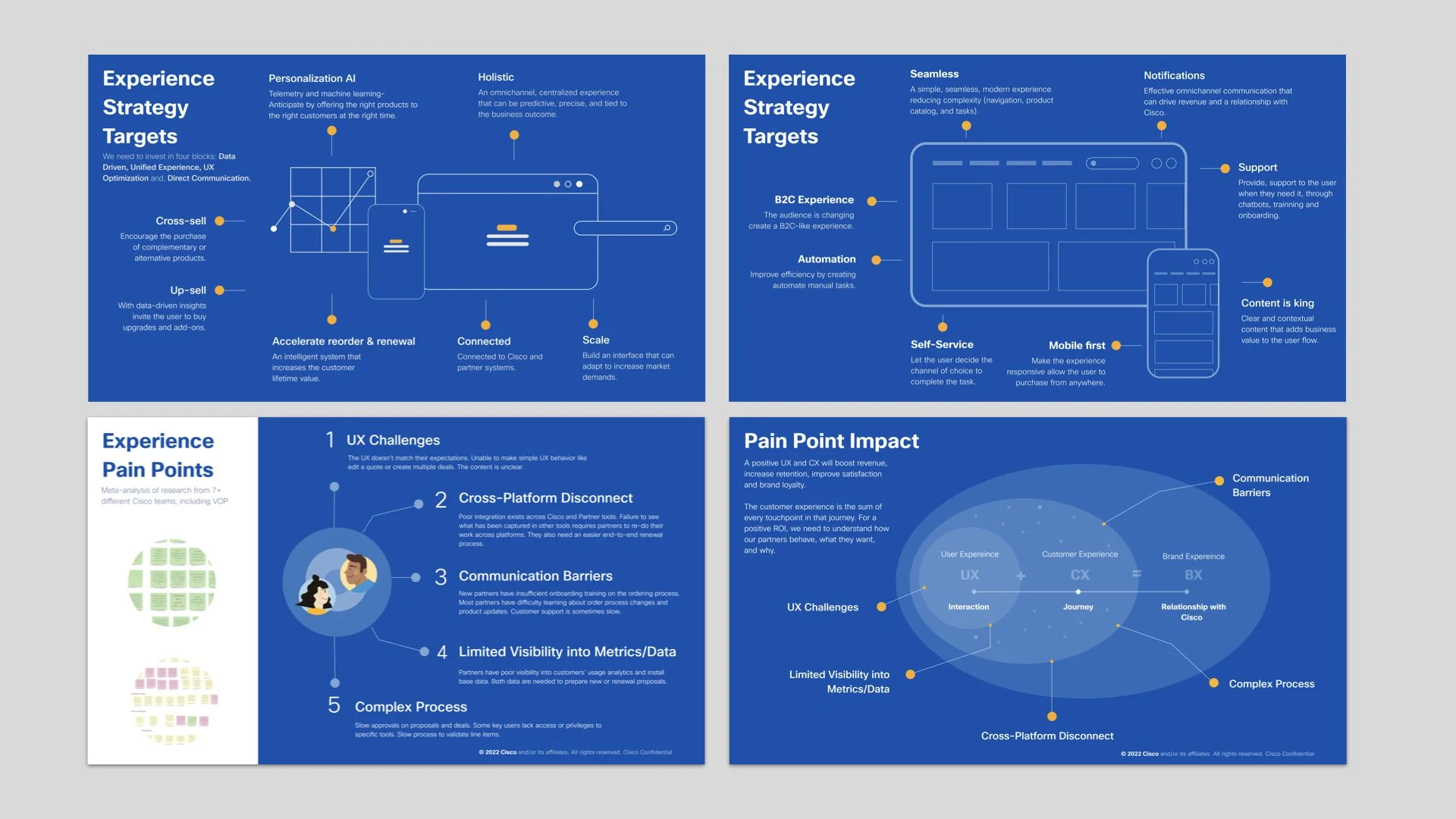 Using key insights from the business and Cisco partners, I identified pain points and experience strategy goals to guide the work. I also shared these findings with stakeholders to build alignment and maintain momentum.